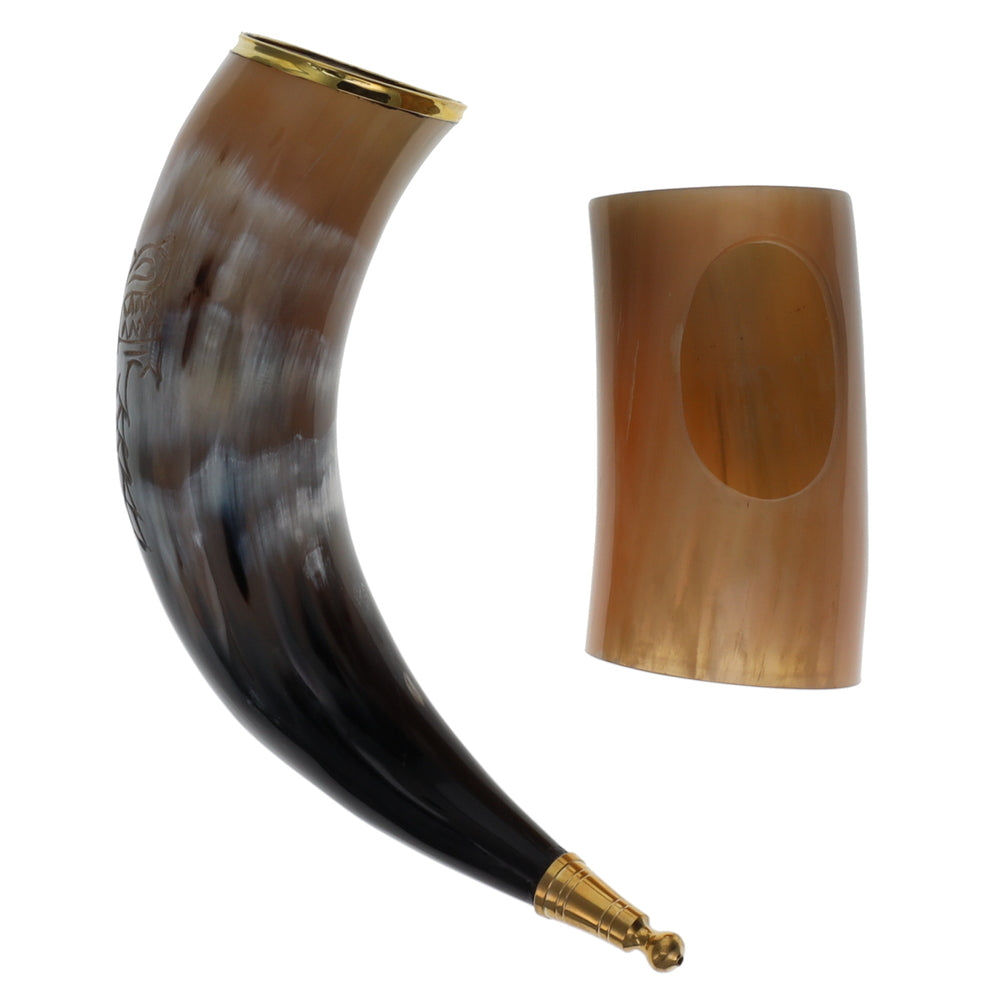With brass accents that beautifully complement the look of the horn, this tankard horn stands at a height of 14.5 inches, making it a noticeable and eye-catching piece. The brass trim adds a touch of sophistication to the overall design, enhancing its visual appeal.
