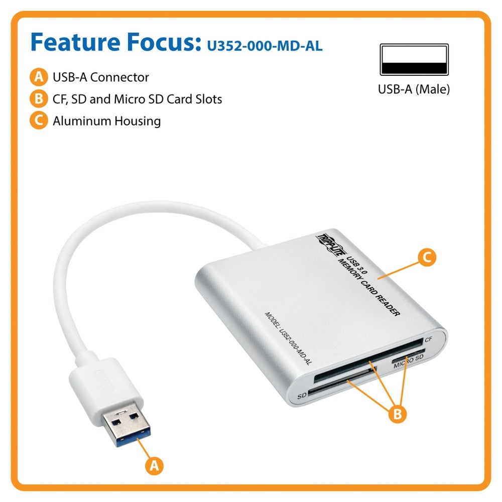 The Tripp Lite U352-000-MD-AL USB 3.0 SuperSpeed Multi-Drive Cables and Connection is a versatile memory card reader/writer enclosed in a durable aluminum case. It allows for seamless data transfer between your tablet, notebook, Ultrabook(TM), Chromebook(TM), or computer and a wide variety of memory cards using the USB port on your electronic device.